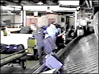 Twisting the torso and keeping the feet stationary when moving baggage between the conveyor and the cart