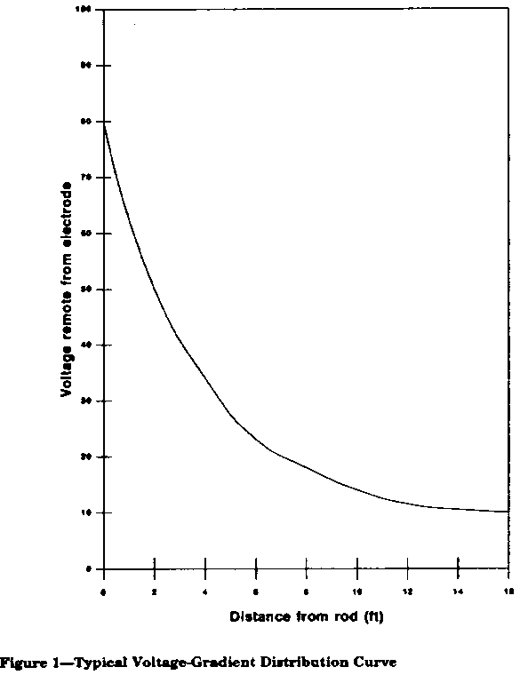 The dissipation of voltage from a grounding electrode (or from the grounded end of an energized grounded object) is called the ground potential gradient. Voltage drops associated with this dissipation of voltage are called ground potentials. Figure 1 is a typical voltage-gradient distribution curve (assuming a uniform soil texture). This graph shows that voltage decreases rapidly with increasing distance from the grounding electrode.