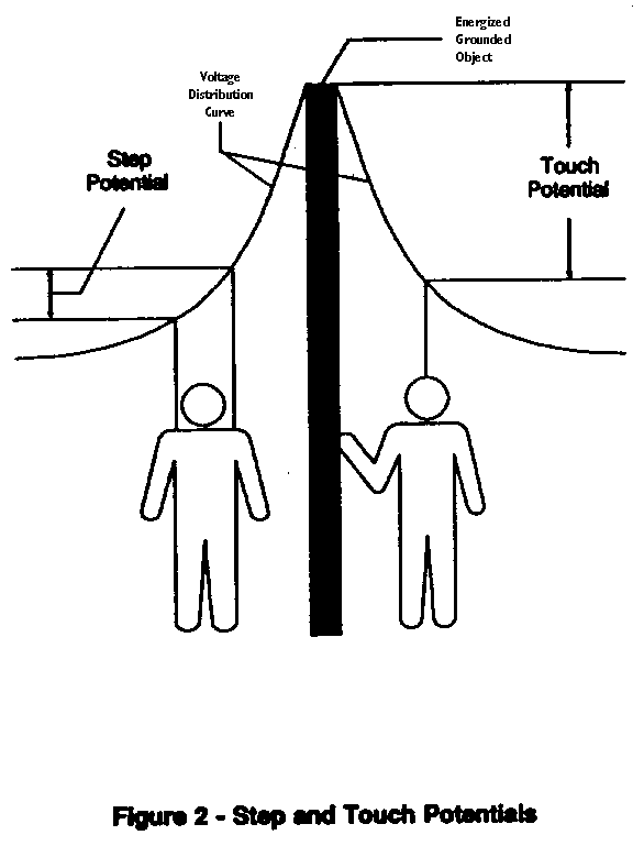 "Step potential" is the voltage between the feet of a person standing near an energized grounded object. It is equal to the difference in voltage, given by the voltage distribution curve, between two points at different distances from the "electrode". A person could be at risk of injury during a fault simply by standing near the grounding point.