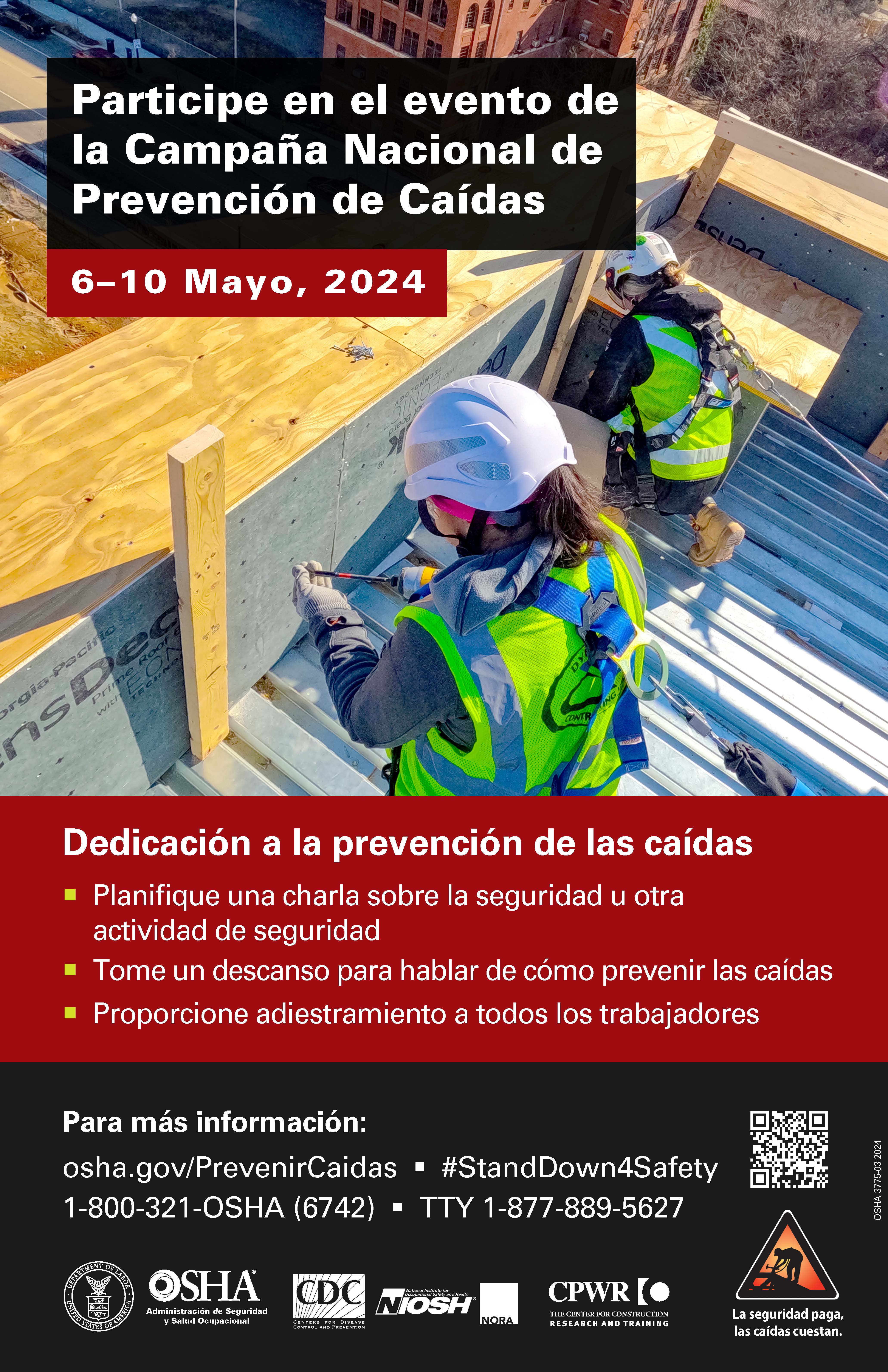 - Webinar: Evento de la Campaña Nacional de Prevención de Caídas 2024. Seminario web en español para aprender sobre análisis de riesgos, mejores prácticas de prevención, efecto del peso en una caída y el síndrome del arnés. (8 de mayo de 2024).